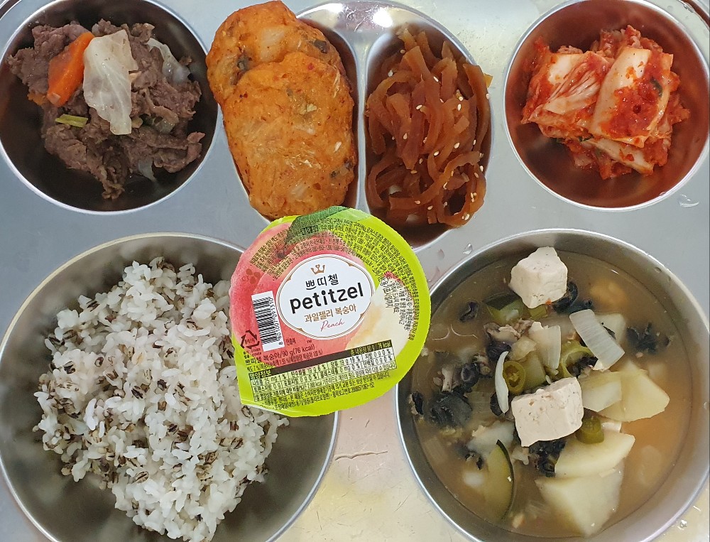 검정보리밥, 우렁된장국5.6.8.9.18, 한우불고기5.6.13.16, 김치전1.5.6, 무채장아찌1.2.5, 배추김치9, 과일젤리