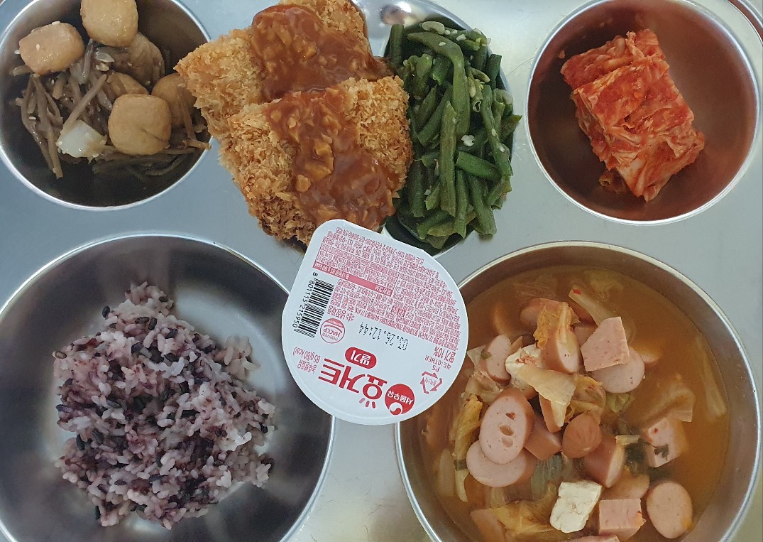 흑미밥, 부대찌개1.2.5.6.8.9.10.13, 돈까스&소스1.2.5.6.10.12.13, 우엉채어묵조림1.5.6.13, 콩줄기볶음5.6, 배추김치9,
