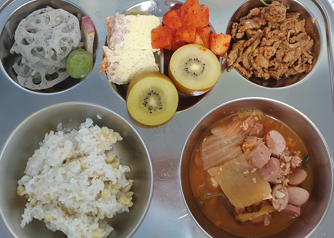 옥수수밥, 부대찌개1.2.5.6.8.9.10.13, 오리불고기1.2.5.6, 연근사과참깨샐러드1.5.6.8.13.18, 달걀찜1.2.5.6.8.9.10.15.16,
