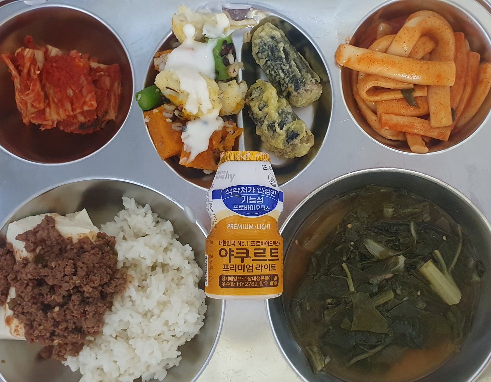 한우연두부비빔밥5.6.13.16, 근대된장국5.6, 두끼떡볶이, 김말이튀김, 단호박곡물샐러드1.13, 배추김치, 요구르트2